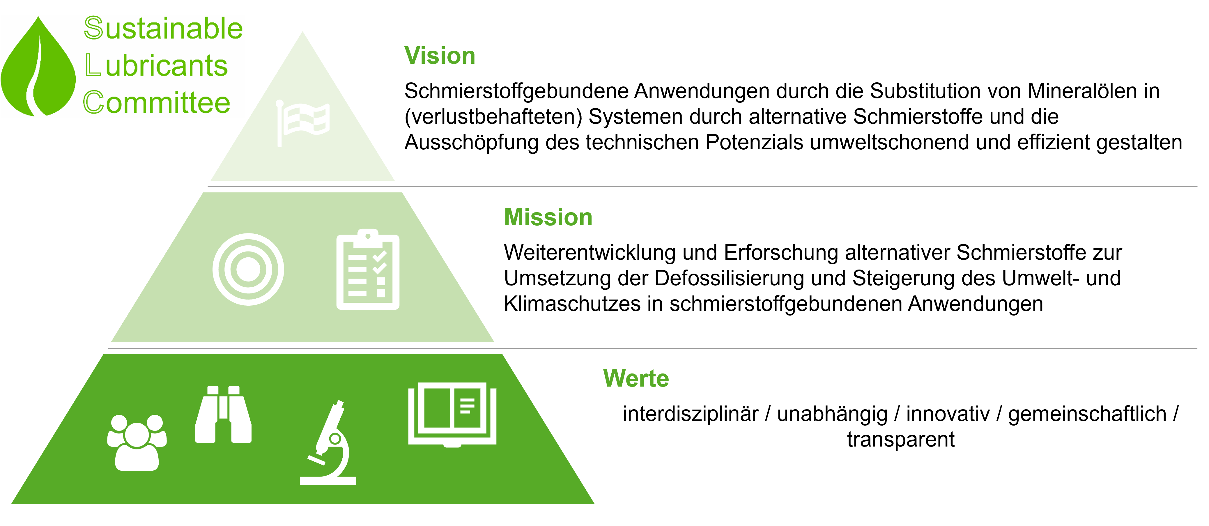 Das Sustainable Lubricants Committee (SLC) verfolgt die Vision schmierstoffgebundene Anwendungen in technischen Bereichen durch die Substitution von Mineralölen durch alternative Schmierstoffe zukunftsfähig zu gestalten. Um dieses Ziel zu Erreichen soll in einem Konsortium die Möglichkeiten zur Umsetzung und Erforschung alternativer Schmierstoffe erarbeitet werden. Hauptaugenmerke sind dabei die Defossilisierung von Schmierstoffen und Steigerung der Nachhaltigkeit in Zusammenhang mit Minderung der durch Schmierstoffe verursachten Umweltschädigung.